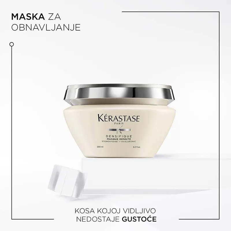 Kérastase Densifique Maska za Kosu je luksuzna maska koja pomaže u poboljšanju gustoće kose. Obogaćena Stemoxydine® koja povećava gustoću kose, hijaluronskom kiselinom koja hidratizira i daje elastičnost, te gluko-peptidima koji vraćaju ujednačenost kose, ova maska čini kosu gušćom, mekšom i zdravijom. S ceramidima koji jačaju vlakna kose, maska pomaže kosi da izgleda punije i vitalnije. Idealna je za srednje grubu i grubu kosu kojoj je potrebna intenzivna njega i volumen.
